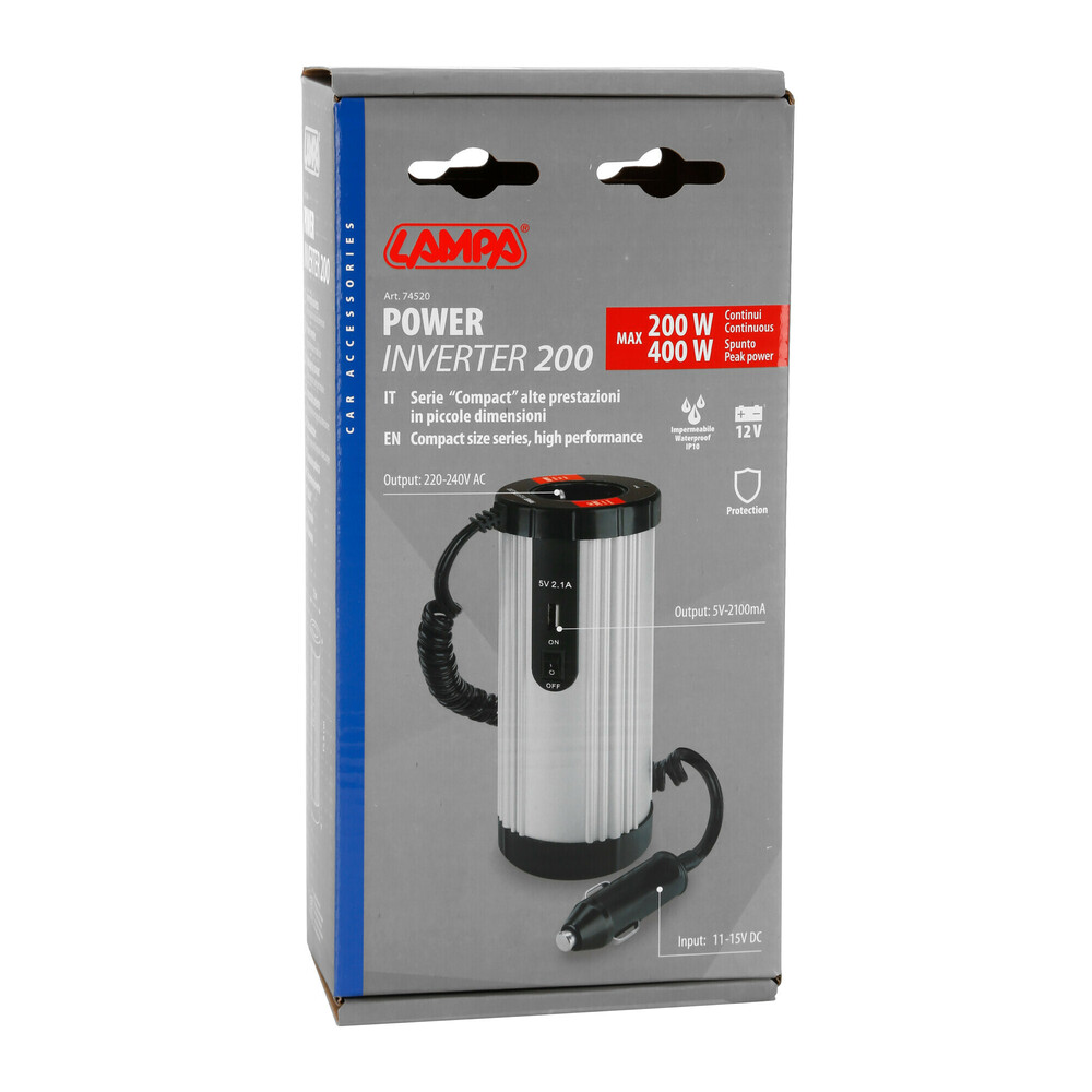 Max. Leistung 200W - max. Spitze 400W Stromtransformator von 12V zu 220V . Gestattet das Anschließen von Geräte, die mit 220V gespeist werden, an jede Energiequelle mit 12V. Struktur aus Aluminiumlegierung Schutz gegen Kurzschlüsse und Überlastungen Verfügt auch über einen USB-Anschluss mit 5V (1000 mA)