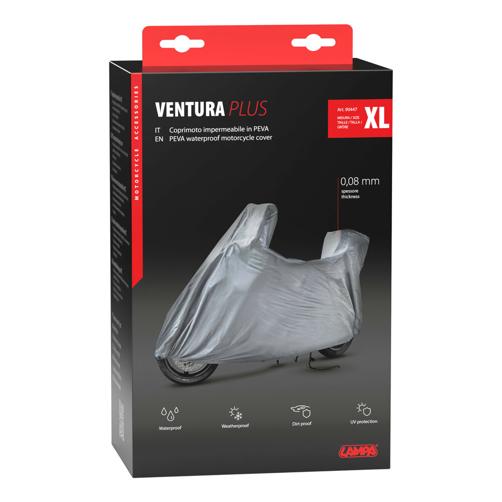 Shaped for motorcycles/scooters with windscreen and top case. Made of PEVA. Weld sewings. Elasticized front and rear hem. Pouch included