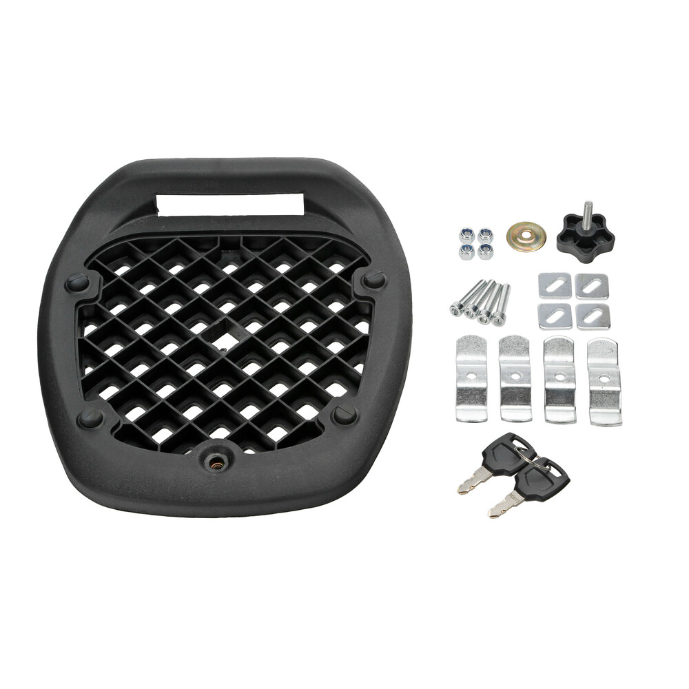 Made of thermoplastic material. Fixing kit included. Supplied with 2 keys. Quick connector-release system. Max load 3 kg. May contains one full-face helmet.