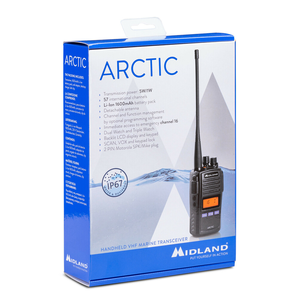 Le émetteur‑récepteur VHF aux grandes caractéristiques : étanchéité certifiée IP67, châssis solide en aluminium, sélection de puissance haute/basse (5 W/1 W), pas moins de 57 canaux internationaux programmables par l’utilisateur, grand écran LCD rétroéclairé et accès immédiat au canal d’urgence 16. Midland Arctic dispose également des fonctions VOX et SCAN, Dual Watch/Triple Watch, de 10 niveaux de squelch, d’un canal prioritaire, du verrouillage du clavier, du Roger Beep (tonalité de fin de communication) et des bips clavier. Grâce à l’indicateur de batterie faible, à l’économiseur automatique d’énergie et au pack batterie Li‑Ion, l’Arctic ne vous laissera jamais sans connexion