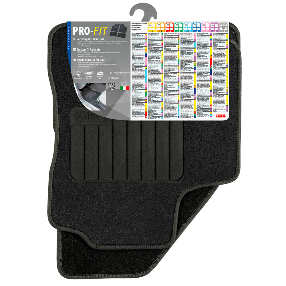 Sagoma e misure personalizzate per adattarsi al pianale della vettura. In moquette automobilistica lavabile, antistatica ed inodore. Con battitacco