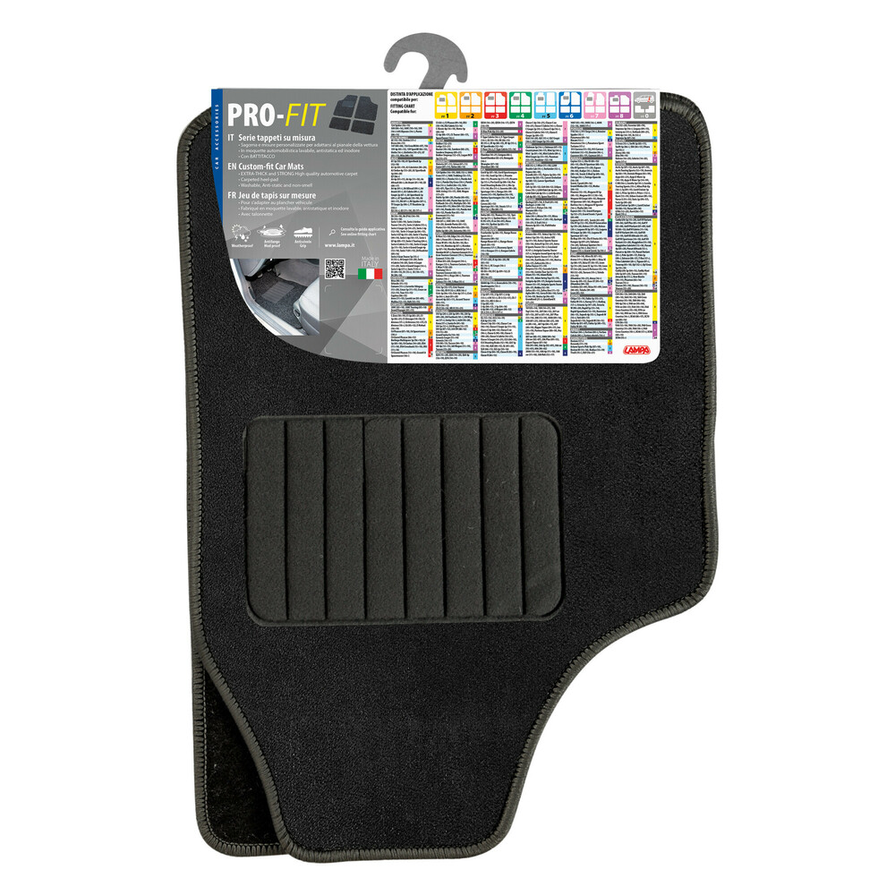 Sagoma e misure personalizzate per adattarsi al pianale della vettura. In moquette automobilistica lavabile, antistatica ed inodore. Con battitacco