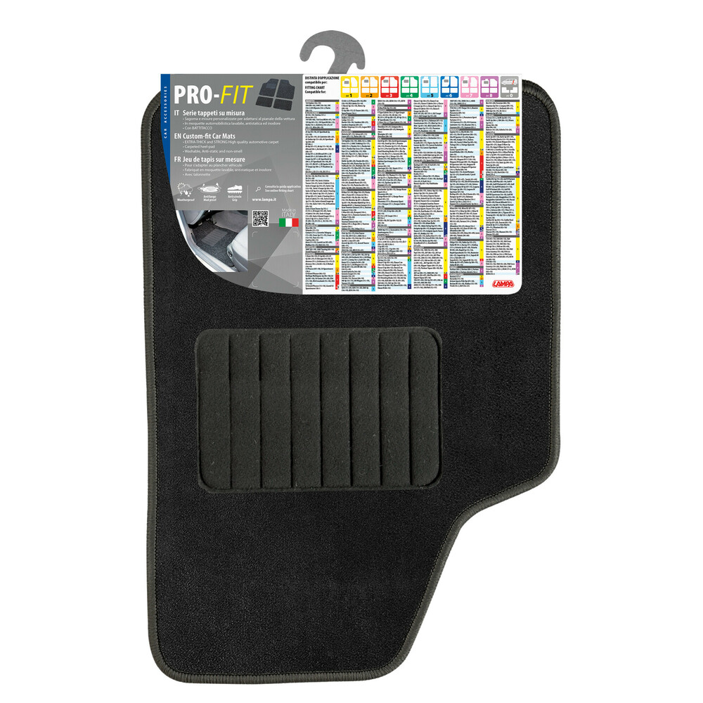 Sagoma e misure personalizzate per adattarsi al pianale della vettura. In moquette automobilistica lavabile, antistatica ed inodore. Con battitacco