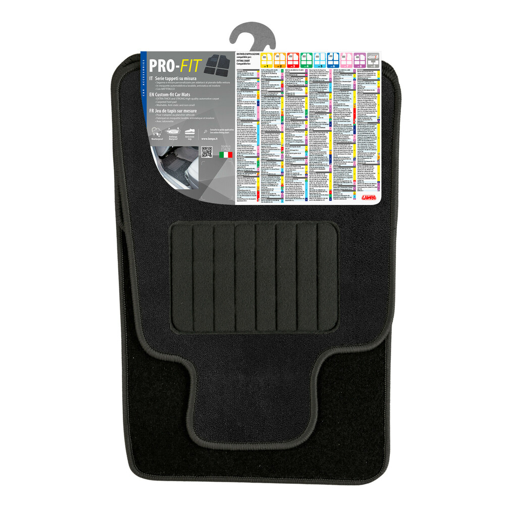 Sagoma e misure personalizzate per adattarsi al pianale della vettura. In moquette automobilistica lavabile, antistatica ed inodore. Con battitacco