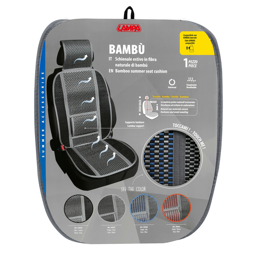 Universale. Con supporto lombare. In estate, anche se il veicolo è climatizzato, le parti a contatto con il sedile rimangono sempre umide o sudate. Lo schienale in bambù permette di viaggiare anche senza aria condizionata evitando di sudare a contatto con i rivestimenti sintetici dei sedili