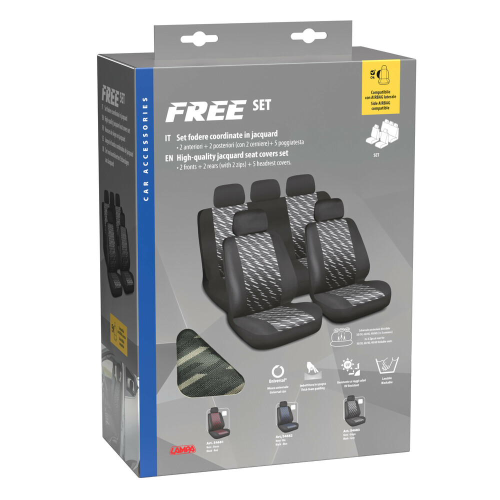 2 anteriori, 2 posteriori (con 3+3 cerniere), 5 copripoggiatesta. Tessuto in poliestere e imbottiture in spugna