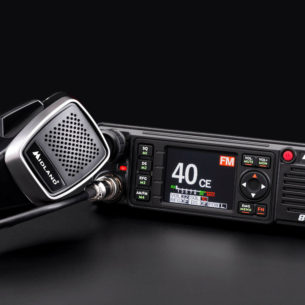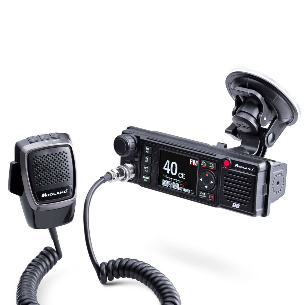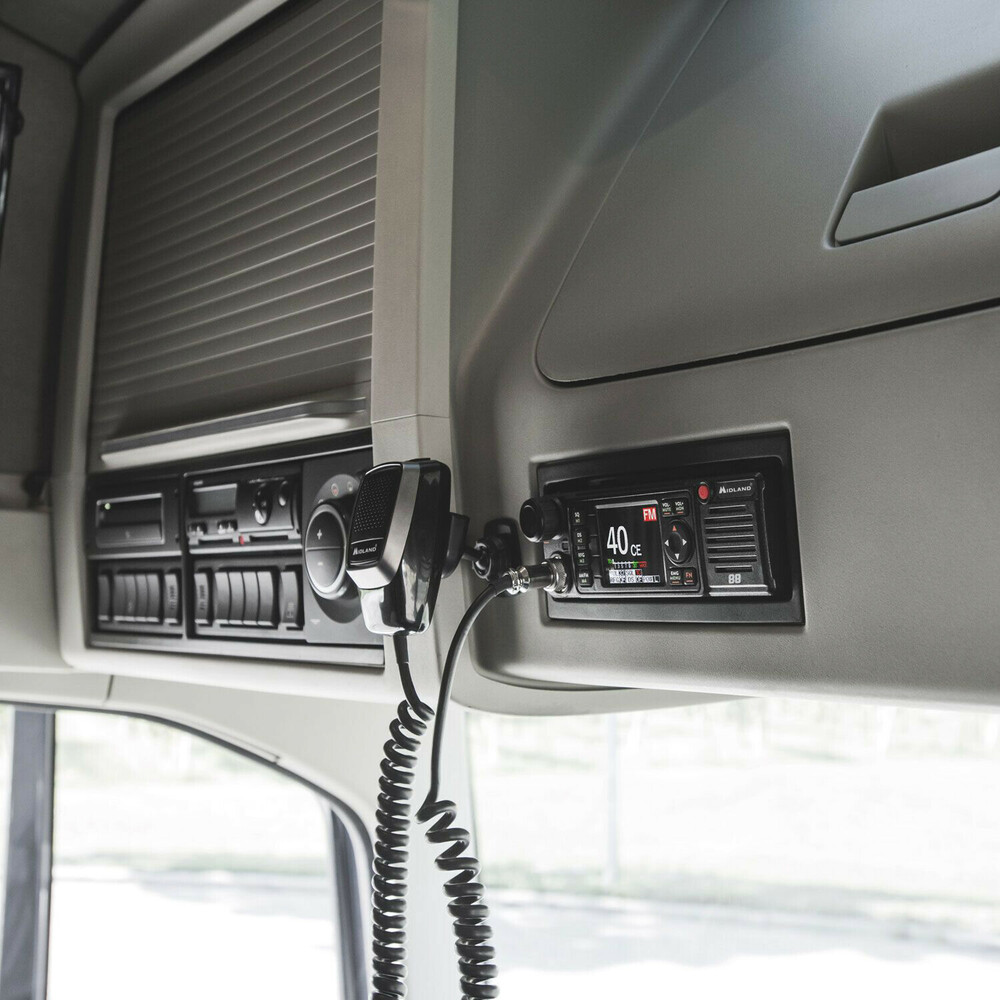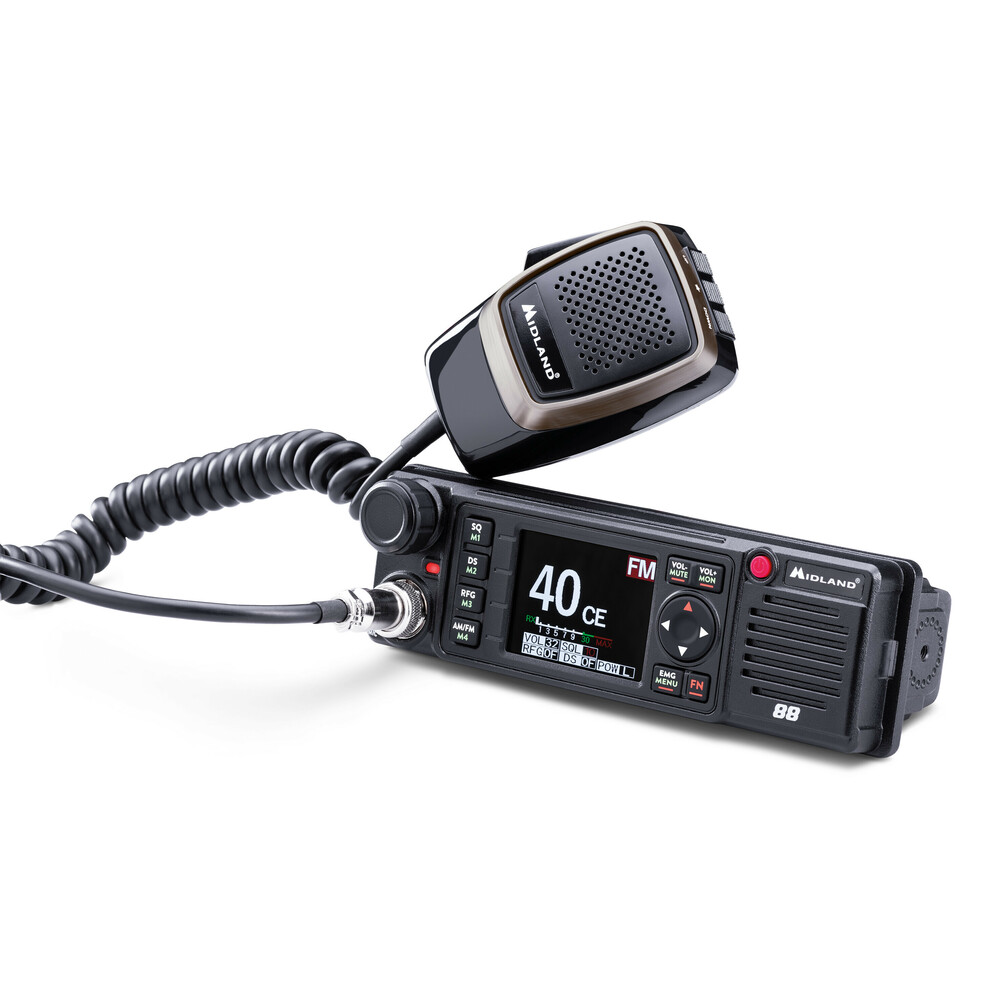 Midland 88 è una radio CB versatile, adatta a qualsiasi superficie e scompartimento DIN, con alimentazione 12/24 V e dotata di protezione per disadattamento del circuito d’antenna.