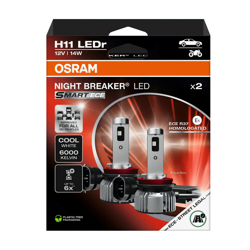 Le nuove NIGHT BREAKER LED SMART ECE H11 di OSRAM sono omologate secondo la norma ECE R37 e di conseguenza omologate per tutti i veicoli a 12V in tutti gli stati membri ECE per tutte le funzioni di illuminazione come sostituzione adatta per tutte le lampade H11.