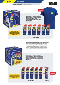 1 PRODOTTI CHIMICI | CHEMICAL PRODUCTS 138-1 PROMOZIONE 6 X 400 ML WD-40 SISTEMA PROFESSIONALE + 1 T-SHIRT IN OMAGGIO PROMOTION 6 X 400 ML WD-40 PROFESSIONAL SYSTEM + 1 FREE T-SHIRT WD391057 Cartone / Carton n 1 PROMOZIONE 5 X 500 ML WD-40 SISTEMA PROFESSIONALE + 1 X 400 ML FLEXIBLE GRATIS PROMOTION: 5 X 500 ML WD-40 PROFESSIONAL SYSTEM + 1 X 400 ML FLEXIBLE FREE OF CHARGE WD39830 Cartone / Carton n 1 WD-40, PRODOTTO MULTIFUNZIONE SISTEMA PROFESSIONALE WD-40 Prodotto Multifunzione lubrifica, elimina cigolii, sblocca, toglie l’umidità, previene la ruggine e protegge tutte le superfici metalliche. Rimuove persino macchie di grasso, catrame e colla da qualunque superficie non porosa. La valvola a 360° consente l’erogazione del prodotto in tutte le posizioni anche con valvola capovolta, rendendolo versatile per svolgere qualsiasi lavoro, garantendo eccellenti performance 5 x 500 ml 400 ml 6 x 400 ml OMAGGIO OMAGGIO DAILY NEWS PROMO VALIDA FINO AD ESAURIMENTO SCORTE PROMOTION VALID WHILE STOCKS LAST PROMO VALIDA FINO AD ESAURIMENTO SCORTE PROMOTION VALID WHILE STOCKS LAST